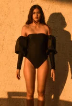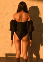 Body en Color Negro Shimmer con Mangas Puffer manga larga removibles. Puedes usar esta pieza como traje de baño o prenda exterior.