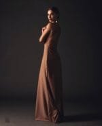 Vestido manga corta con abertura trasera y escote en espalda y aplique decorativo con baño en plata.