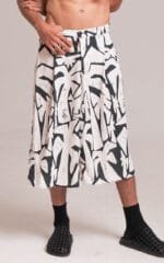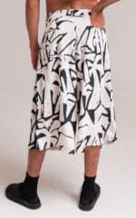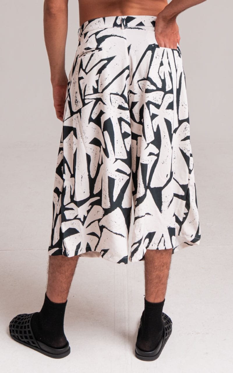 Bermuda larga con pinzas y tiro alto, pretina plana y 4 bolsillos.