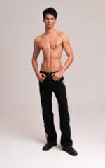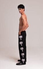 Jean Unisex, silueta LOOSE FIT. Color negro, 5 bolsillos. con apliques en los laterales en material de piedras cónicas.