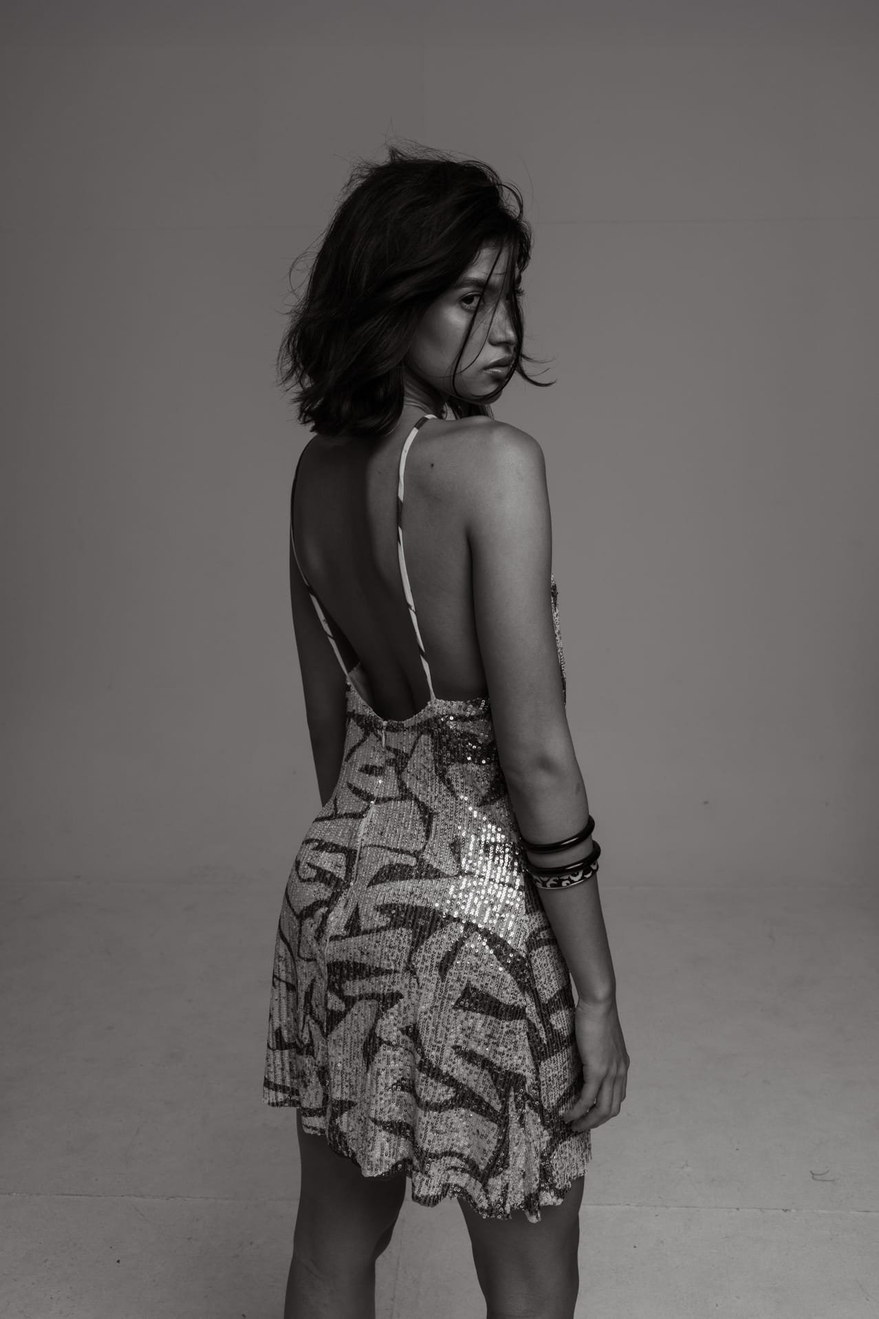 Vestido corto con silueta halter, con espalda abierta y tiras ajustables. En lentejuelas estampadas.